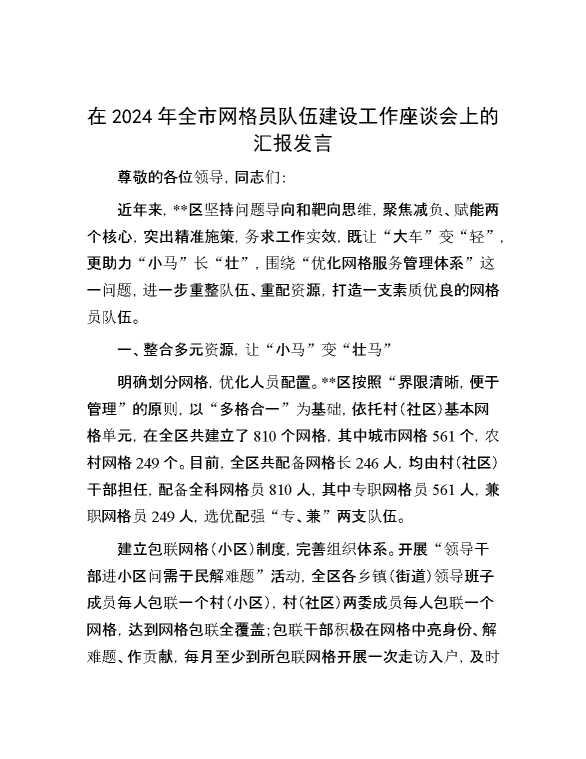 在2024年全市网格员队伍建设工作座谈会上的汇报发言 2024-10-30 Word模板 91 购买前,请一定要先点击这里看看,欢迎持续关注,精彩模板每天推送 预览结束,本文件为word文档,一共5页,共2339字,请购买后,下载后查看 购买前,请一定要先点击这里看看,欢迎持续关注,精彩模板每天推送 资源下载下载价格29 RMBVIP免费升级VIP点击检测网盘有效后购买有任何充值和下载问题请加微信:xuexixuexi66 0 演讲发言