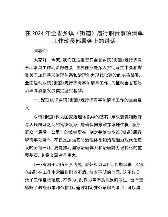 在2024年全省乡镇(街道)履行职责事项清单工作动员部署会上的讲话 2024-10-30 Word模板 99 购买前,请一定要先点击这里看看,欢迎持续关注,精彩模板每天推送 预览结束,本文件为word文档,一共7页,共3073字,请购买后,下载后查看 购买前,请一定要先点击这里看看,欢迎持续关注,精彩模板每天推送 资源下载下载价格29 RMBVIP免费升级VIP点击检测网盘有效后购买有任何充值和下载问题请加微信:xuexixuexi66 0 演讲发言