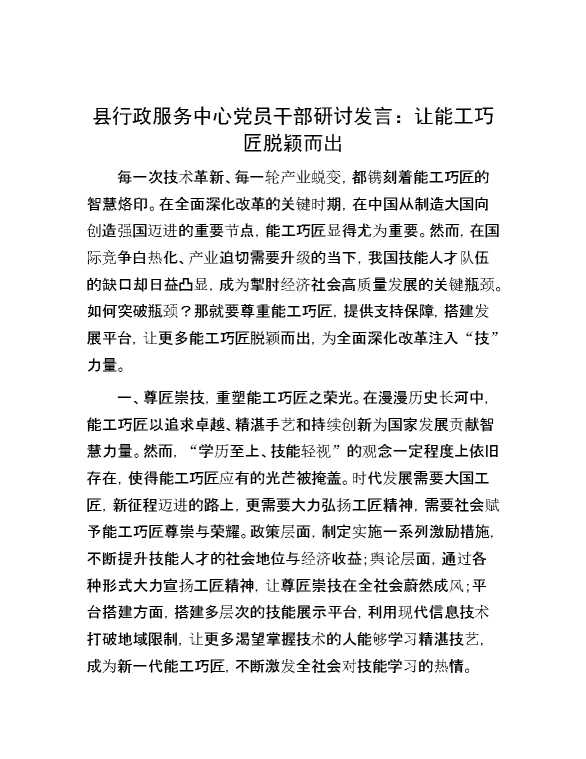 县行政服务中心党员干部研讨发言:让能工巧匠脱颖而出 2024-10-30 Word模板 63 购买前,请一定要先点击这里看看,欢迎持续关注,精彩模板每天推送 预览结束,本文件为word文档,一共3页,共1071字,请购买后,下载后查看 购买前,请一定要先点击这里看看,欢迎持续关注,精彩模板每天推送 资源下载下载价格29 RMBVIP免费升级VIP点击检测网盘有效后购买有任何充值和下载问题请加微信:xuexixuexi66 0 演讲发言