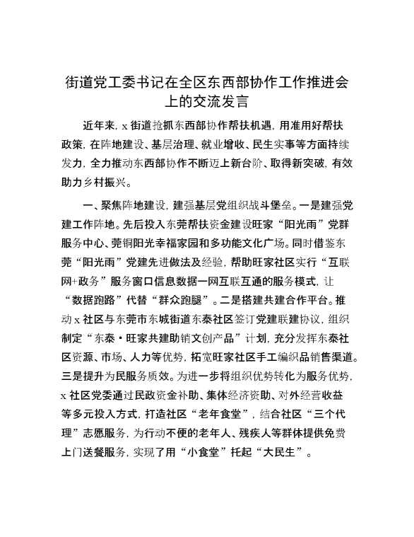 街道党工委书记在全区东西部协作工作推进会上的交流发言 2024-10-30 Word模板 72 购买前,请一定要先点击这里看看,欢迎持续关注,精彩模板每天推送 预览结束,本文件为word文档,一共4页,共1737字,请购买后,下载后查看 购买前,请一定要先点击这里看看,欢迎持续关注,精彩模板每天推送 资源下载下载价格29 RMBVIP免费升级VIP点击检测网盘有效后购买有任何充值和下载问题请加微信:xuexixuexi66 0 演讲发言