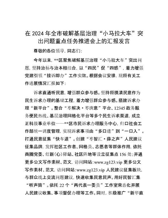 在2024年全市破解基层治理“小马拉大车”突出问题重点任务推进会上的汇报发言 2024-11-04 Word模板 75 购买前,请一定要先点击这里看看,欢迎持续关注,精彩模板每天推送 预览结束,本文件为word文档,一共3页,共1361字,请购买后,下载后查看 购买前,请一定要先点击这里看看,欢迎持续关注,精彩模板每天推送 资源下载下载价格29 RMBVIP免费升级VIP点击检测网盘有效后购买有任何充值和下载问题请加微信:xuexixuexi66 0 演讲发言