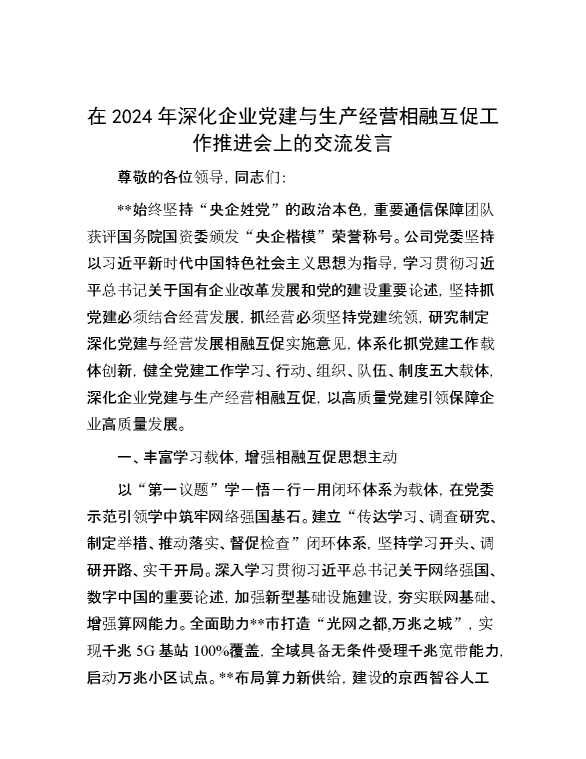 在2024年深化企业党建与生产经营相融互促工作推进会上的交流发言 2024-11-04 Word模板 80 购买前,请一定要先点击这里看看,欢迎持续关注,精彩模板每天推送 预览结束,本文件为word文档,一共10页,共4568字,请购买后,下载后查看 购买前,请一定要先点击这里看看,欢迎持续关注,精彩模板每天推送 资源下载下载价格29 RMBVIP免费升级VIP点击检测网盘有效后购买有任何充值和下载问题请加微信:xuexixuexi66 0 演讲发言