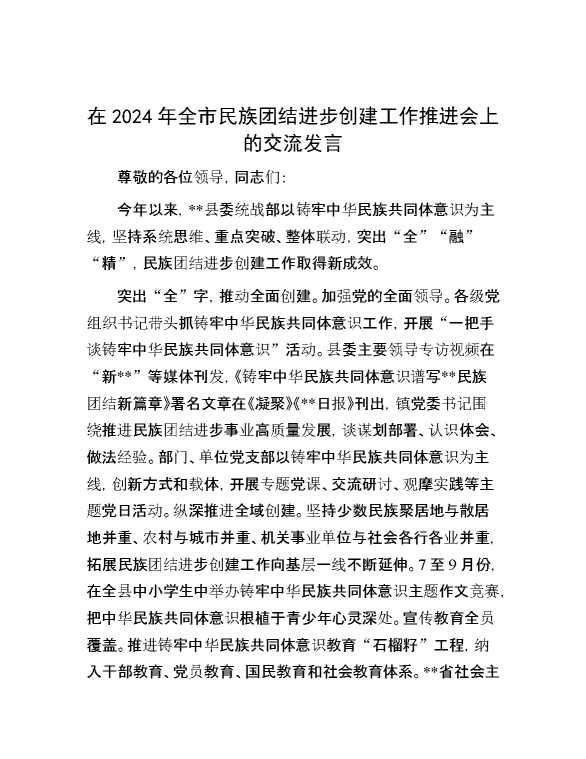 在2024年全市民族团结进步创建工作推进会上的交流发言 2024-11-04 Word模板 85 购买前,请一定要先点击这里看看,欢迎持续关注,精彩模板每天推送 预览结束,本文件为word文档,一共3页,共1476字,请购买后,下载后查看 购买前,请一定要先点击这里看看,欢迎持续关注,精彩模板每天推送 资源下载下载价格29 RMBVIP免费升级VIP点击检测网盘有效后购买有任何充值和下载问题请加微信:xuexixuexi66 0 演讲发言