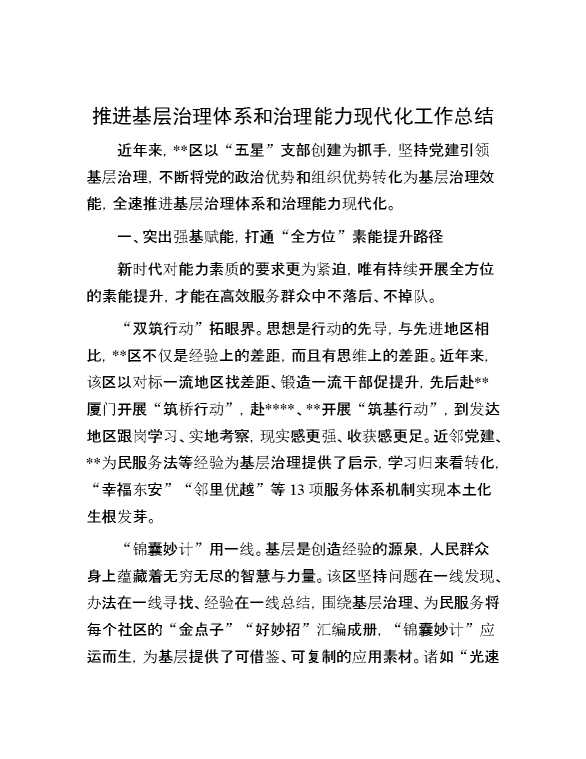 推进基层治理体系和治理能力现代化工作总结 2024-11-04 Word模板 79 购买前,请一定要先点击这里看看,欢迎持续关注,精彩模板每天推送 预览结束,本文件为word文档,一共5页,共2053字,请购买后,下载后查看 购买前,请一定要先点击这里看看,欢迎持续关注,精彩模板每天推送 资源下载下载价格29 RMBVIP免费升级VIP点击检测网盘有效后购买有任何充值和下载问题请加微信:xuexixuexi66 0 总结汇报