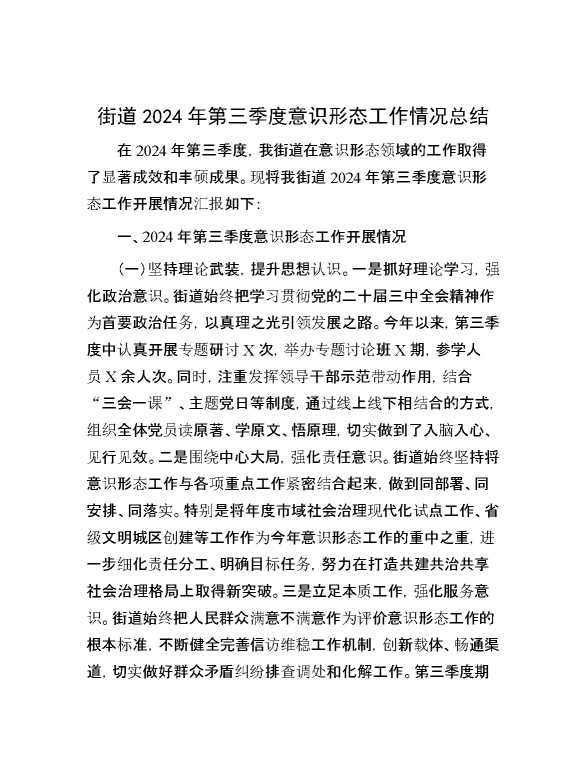 街道2024年第三季度意识形态工作情况总结 2024-11-04 Word模板 81 购买前,请一定要先点击这里看看,欢迎持续关注,精彩模板每天推送 预览结束,本文件为word文档,一共5页,共2335字,请购买后,下载后查看 购买前,请一定要先点击这里看看,欢迎持续关注,精彩模板每天推送 资源下载下载价格29 RMBVIP免费升级VIP点击检测网盘有效后购买有任何充值和下载问题请加微信:xuexixuexi66 0 总结汇报