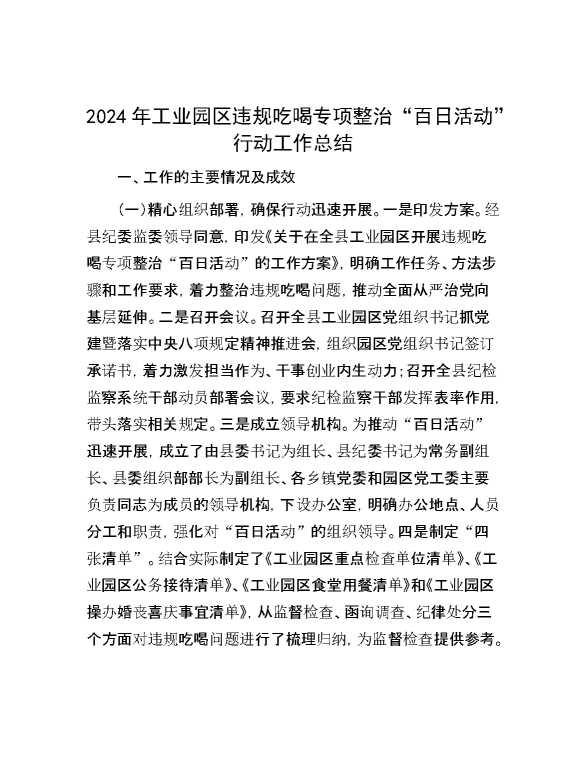 2024年工业园区违规吃喝专项整治“百日活动”行动工作总结 2024-11-04 Word模板 78 购买前,请一定要先点击这里看看,欢迎持续关注,精彩模板每天推送 预览结束,本文件为word文档,一共6页,共2617字,请购买后,下载后查看 购买前,请一定要先点击这里看看,欢迎持续关注,精彩模板每天推送 资源下载下载价格29 RMBVIP免费升级VIP点击检测网盘有效后购买有任何充值和下载问题请加微信:xuexixuexi66 0 总结汇报