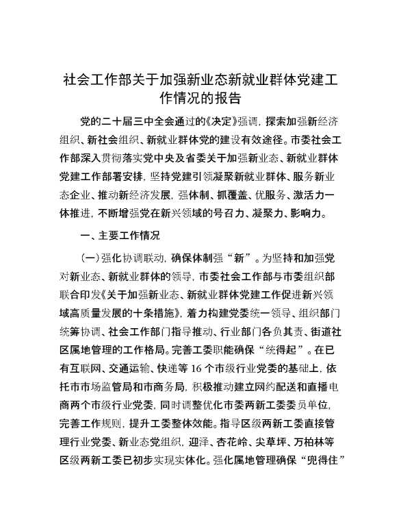 社会工作部关于加强新业态新就业群体党建工作情况的报告 2024-11-04 Word模板 80 购买前,请一定要先点击这里看看,欢迎持续关注,精彩模板每天推送 预览结束,本文件为word文档,一共6页,共2643字,请购买后,下载后查看 购买前,请一定要先点击这里看看,欢迎持续关注,精彩模板每天推送 资源下载下载价格29 RMBVIP免费升级VIP点击检测网盘有效后购买有任何充值和下载问题请加微信:xuexixuexi66 0 总结汇报