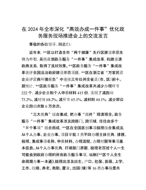 在2024年全市深化“高效办成一件事”优化政务服务现场推进会上的交流发言 2024-11-06 Word模板 84 购买前,请一定要先点击这里看看,欢迎持续关注,精彩模板每天推送 预览结束,本文件为word文档,一共4页,共1515字,请购买后,下载后查看 购买前,请一定要先点击这里看看,欢迎持续关注,精彩模板每天推送 资源下载下载价格29 RMBVIP免费升级VIP点击检测网盘有效后购买有任何充值和下载问题请加微信:xuexixuexi66 0 演讲发言