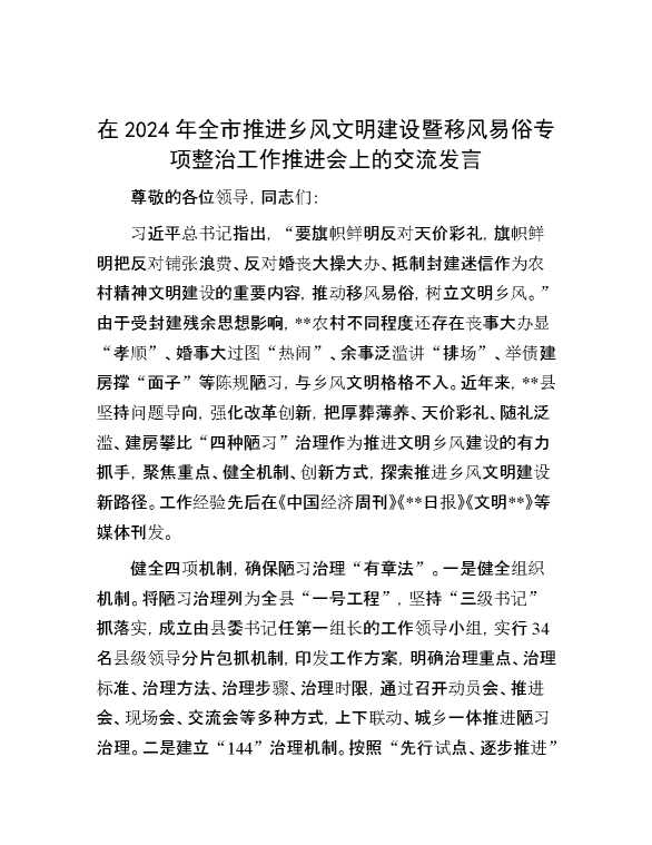 在2024年全市推进乡风文明建设暨移风易俗专项整治工作推进会上的交流发言 2024-11-06 Word模板 88 购买前,请一定要先点击这里看看,欢迎持续关注,精彩模板每天推送 预览结束,本文件为word文档,一共4页,共1906字,请购买后,下载后查看 购买前,请一定要先点击这里看看,欢迎持续关注,精彩模板每天推送 资源下载下载价格29 RMBVIP免费升级VIP点击检测网盘有效后购买有任何充值和下载问题请加微信:xuexixuexi66 0 演讲发言