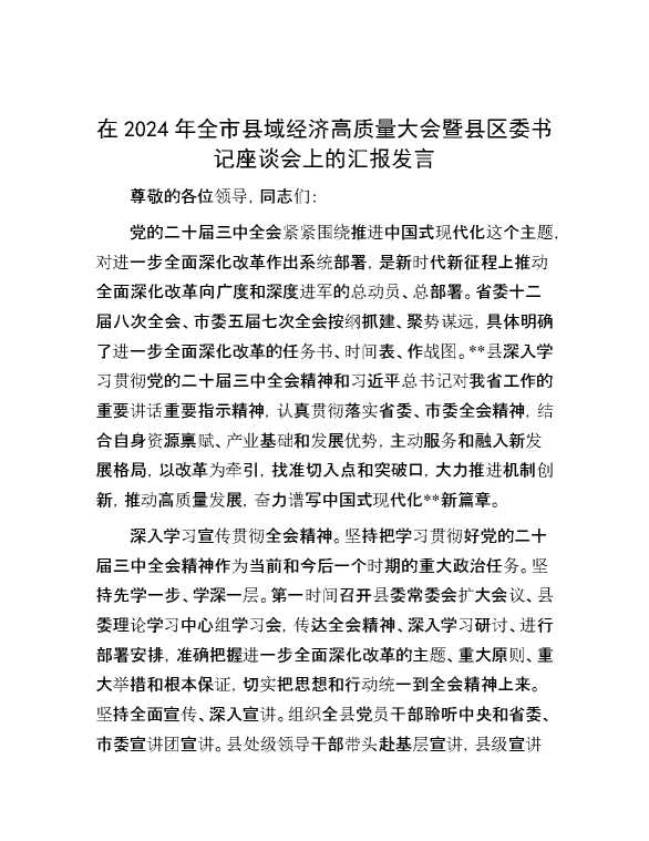 在2024年全市县域经济高质量大会暨县区委书记座谈会上的汇报发言 2024-11-06 Word模板 84 购买前,请一定要先点击这里看看,欢迎持续关注,精彩模板每天推送 预览结束,本文件为word文档,一共6页,共2890字,请购买后,下载后查看 购买前,请一定要先点击这里看看,欢迎持续关注,精彩模板每天推送 资源下载下载价格29 RMBVIP免费升级VIP点击检测网盘有效后购买有任何充值和下载问题请加微信:xuexixuexi66 0 演讲发言