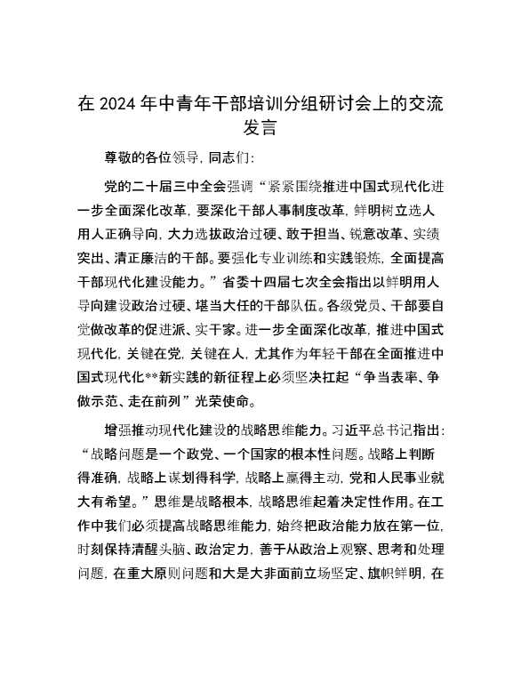在2024年中青年干部培训分组研讨会上的交流发言 2024-11-06 Word模板 91 购买前,请一定要先点击这里看看,欢迎持续关注,精彩模板每天推送 预览结束,本文件为word文档,一共4页,共1464字,请购买后,下载后查看 购买前,请一定要先点击这里看看,欢迎持续关注,精彩模板每天推送 资源下载下载价格29 RMBVIP免费升级VIP点击检测网盘有效后购买有任何充值和下载问题请加微信:xuexixuexi66 0 演讲发言