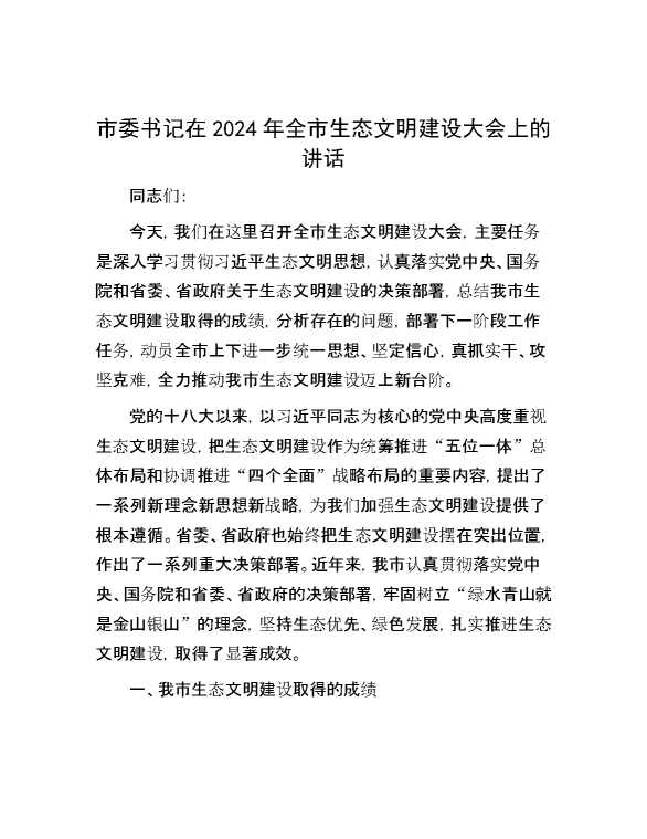 市委书记在2024年全市生态文明建设大会上的讲话 2024-11-06 Word模板 89 购买前,请一定要先点击这里看看,欢迎持续关注,精彩模板每天推送 预览结束,本文件为word文档,一共7页,共3046字,请购买后,下载后查看 购买前,请一定要先点击这里看看,欢迎持续关注,精彩模板每天推送 资源下载下载价格29 RMBVIP免费升级VIP点击检测网盘有效后购买有任何充值和下载问题请加微信:xuexixuexi66 0 演讲发言