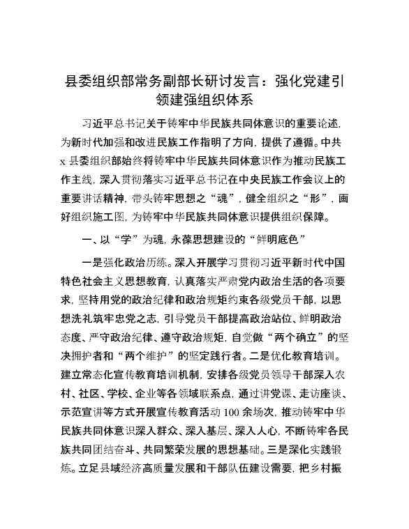 县委组织部常务副部长研讨发言:强化党建引领 建强组织体系 2024-11-06 Word模板 83 购买前,请一定要先点击这里看看,欢迎持续关注,精彩模板每天推送 预览结束,本文件为word文档,一共4页,共1545字,请购买后,下载后查看 购买前,请一定要先点击这里看看,欢迎持续关注,精彩模板每天推送 资源下载下载价格29 RMBVIP免费升级VIP点击检测网盘有效后购买有任何充值和下载问题请加微信:xuexixuexi66 0 演讲发言