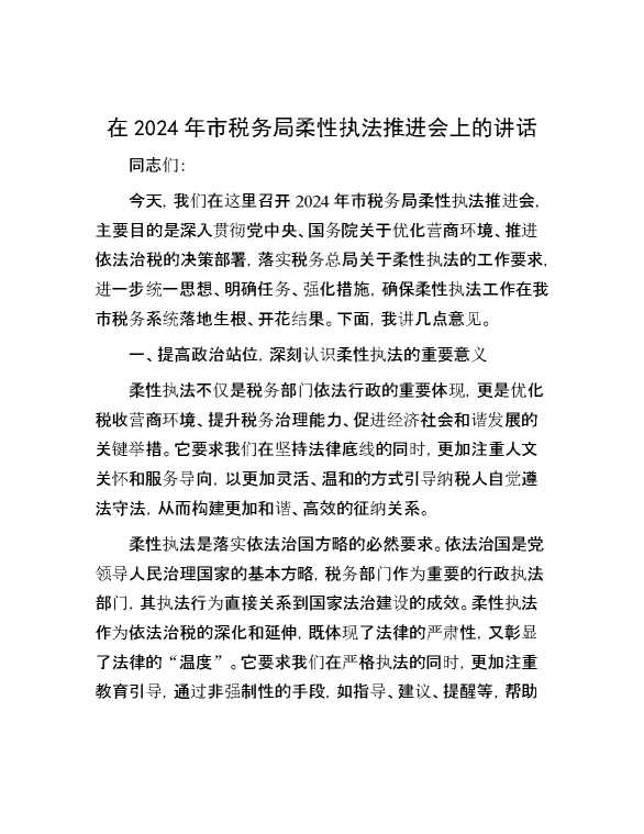 在2024年市税务局柔性执法推进会上的讲话 2024-11-11 Word模板 86 购买前,请一定要先点击这里看看,欢迎持续关注,精彩模板每天推送 预览结束,本文件为word文档,一共5页,共2321字,请购买后,下载后查看 购买前,请一定要先点击这里看看,欢迎持续关注,精彩模板每天推送 资源下载下载价格29 RMBVIP免费升级VIP点击检测网盘有效后购买有任何充值和下载问题请加微信:xuexixuexi66 0 演讲发言