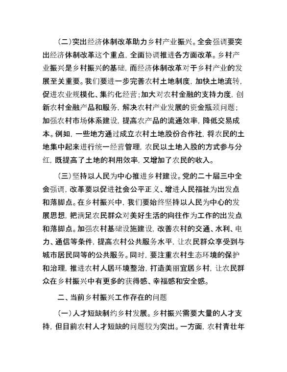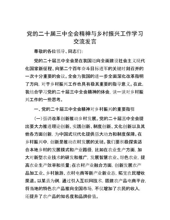 党的二十届三中全会精神与乡村振兴工作学习交流发言 2024-11-19 Word模板 71 购买前,请一定要先点击这里看看,欢迎持续关注,精彩模板每天推送 预览结束,本文件为word文档,一共5页,共2182字,请购买后,下载后查看 购买前,请一定要先点击这里看看,欢迎持续关注,精彩模板每天推送 资源下载下载价格29 RMBVIP免费升级VIP点击检测网盘有效后购买有任何充值和下载问题请加微信:xuexixuexi66 0 演讲发言