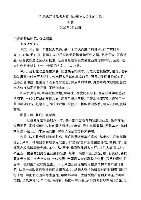 石勇:在纪念辽县易名左权县80周年大会上的讲话 2024-12-05 Word模板 83 购买前,请一定要先点击这里看看,欢迎持续关注,精彩模板每天推送 预览结束,本文件为word文档,一共4页,共3082字,请购买后,下载后查看 购买前,请一定要先点击这里看看,欢迎持续关注,精彩模板每天推送 资源下载下载价格29 RMBVIP免费升级VIP点击检测网盘有效后购买有任何充值和下载问题请加微信:xuexixuexi66 0 演讲发言
