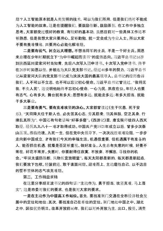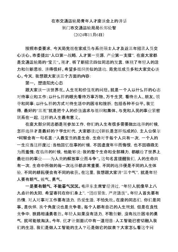 荆门市交通运输局局长郑伦智:在市交通运输局青年人才座谈会上的讲话 2024-12-05 Word模板 72 购买前,请一定要先点击这里看看,欢迎持续关注,精彩模板每天推送 预览结束,本文件为word文档,一共5页,共4160字,请购买后,下载后查看 购买前,请一定要先点击这里看看,欢迎持续关注,精彩模板每天推送 资源下载下载价格29 RMBVIP免费升级VIP点击检测网盘有效后购买有任何充值和下载问题请加微信:xuexixuexi66 0 演讲发言