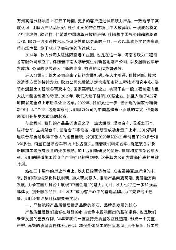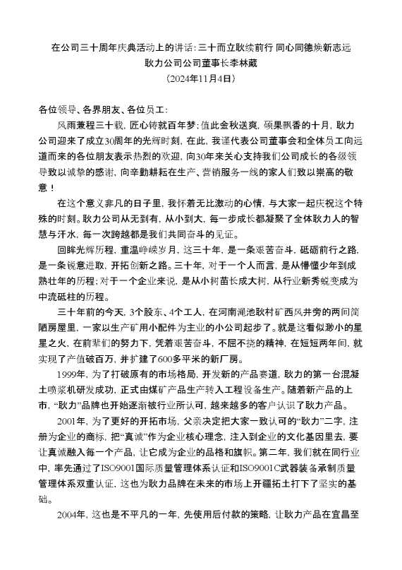 耿力公司公司董事长李林葳:在公司三十周年庆典活动上的讲话:三十而立耿续前行同心同德焕新志远 2024-12-05 Word模板 68 购买前,请一定要先点击这里看看,欢迎持续关注,精彩模板每天推送 预览结束,本文件为word文档,一共5页,共4239字,请购买后,下载后查看 购买前,请一定要先点击这里看看,欢迎持续关注,精彩模板每天推送 资源下载下载价格29 RMBVIP免费升级VIP点击检测网盘有效后购买有任何充值和下载问题请加微信:xuexixuexi66 0 演讲发言