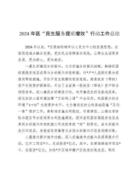 2024年区“民生服务提质增效”行动工作总结 2024-12-09 Word模板 98 购买前,请一定要先点击这里看看,欢迎持续关注,精彩模板每天推送 预览结束,本文件为word文档,一共4页,共1497字,请购买后,下载后查看 购买前,请一定要先点击这里看看,欢迎持续关注,精彩模板每天推送 资源下载下载价格29 RMBVIP免费升级VIP点击检测网盘有效后购买有任何充值和下载问题请加微信:xuexixuexi66 0 总结汇报