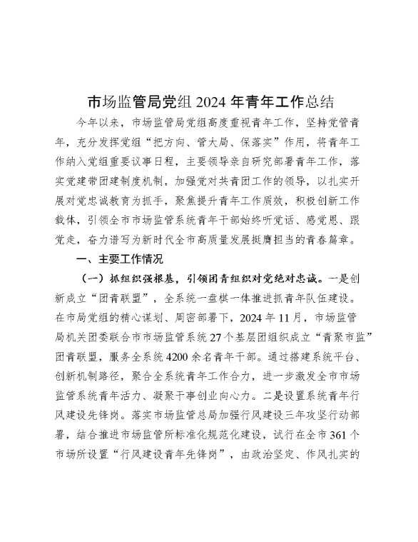 市场监管局党组2024年青年工作总结 2024-12-09 Word模板 91 购买前,请一定要先点击这里看看,欢迎持续关注,精彩模板每天推送 预览结束,本文件为word文档,一共6页,共2446字,请购买后,下载后查看 购买前,请一定要先点击这里看看,欢迎持续关注,精彩模板每天推送 资源下载下载价格29 RMBVIP免费升级VIP点击检测网盘有效后购买有任何充值和下载问题请加微信:xuexixuexi66 0 总结汇报