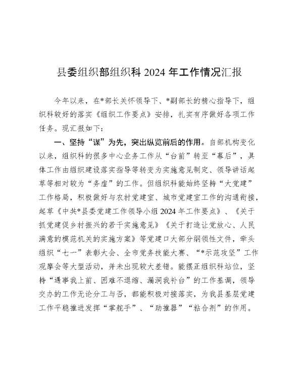 县委组织部组织科2024年工作情况汇报 2024-12-09 Word模板 85 购买前,请一定要先点击这里看看,欢迎持续关注,精彩模板每天推送 预览结束,本文件为word文档,一共4页,共1356字,请购买后,下载后查看 购买前,请一定要先点击这里看看,欢迎持续关注,精彩模板每天推送 资源下载下载价格29 RMBVIP免费升级VIP点击检测网盘有效后购买有任何充值和下载问题请加微信:xuexixuexi66 0 总结汇报