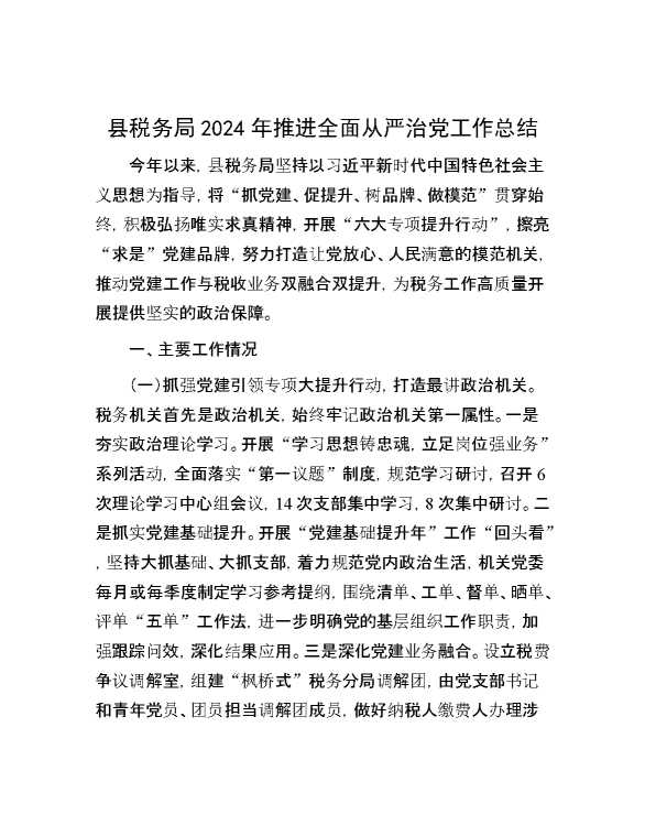 县税务局2024年推进全面从严治党工作总结 2024-12-09 Word模板 83 购买前,请一定要先点击这里看看,欢迎持续关注,精彩模板每天推送 预览结束,本文件为word文档,一共6页,共2573字,请购买后,下载后查看 购买前,请一定要先点击这里看看,欢迎持续关注,精彩模板每天推送 资源下载下载价格29 RMBVIP免费升级VIP点击检测网盘有效后购买有任何充值和下载问题请加微信:xuexixuexi66 0 总结汇报