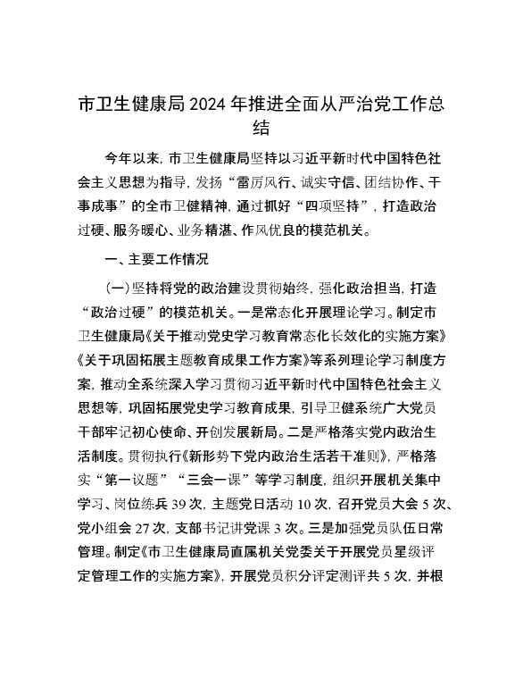 市卫生健康局2024年推进全面从严治党工作总结 2024-12-09 Word模板 84 购买前,请一定要先点击这里看看,欢迎持续关注,精彩模板每天推送 预览结束,本文件为word文档,一共5页,共2040字,请购买后,下载后查看 购买前,请一定要先点击这里看看,欢迎持续关注,精彩模板每天推送 资源下载下载价格29 RMBVIP免费升级VIP点击检测网盘有效后购买有任何充值和下载问题请加微信:xuexixuexi66 0 总结汇报