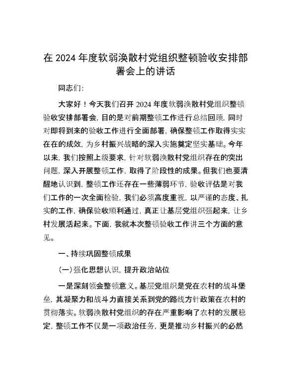 在2024年度软弱涣散村党组织整顿验收安排部署会上的讲话 2024-12-09 Word模板 85 购买前,请一定要先点击这里看看,欢迎持续关注,精彩模板每天推送 预览结束,本文件为word文档,一共7页,共3075字,请购买后,下载后查看 购买前,请一定要先点击这里看看,欢迎持续关注,精彩模板每天推送 资源下载下载价格29 RMBVIP免费升级VIP点击检测网盘有效后购买有任何充值和下载问题请加微信:xuexixuexi66 0 演讲发言