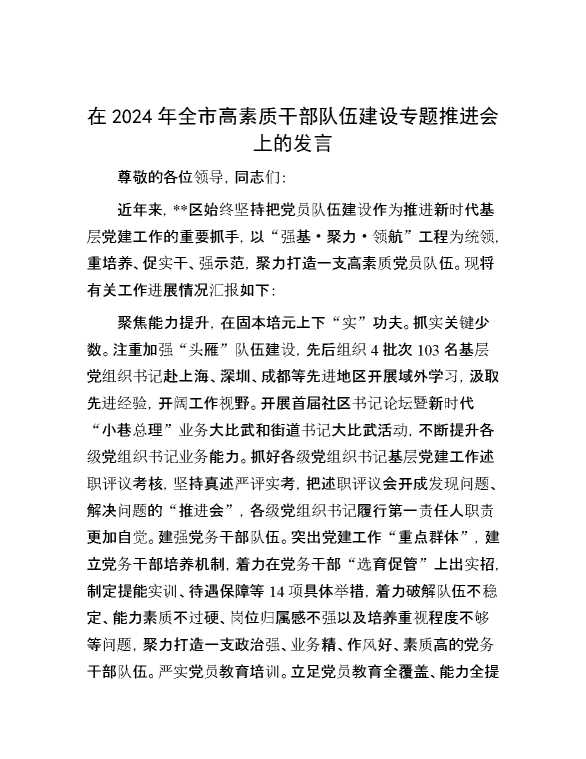 在2024年全市高素质干部队伍建设专题推进会上的发言 2024-12-09 Word模板 82 购买前,请一定要先点击这里看看,欢迎持续关注,精彩模板每天推送 预览结束,本文件为word文档,一共4页,共1562字,请购买后,下载后查看 购买前,请一定要先点击这里看看,欢迎持续关注,精彩模板每天推送 资源下载下载价格29 RMBVIP免费升级VIP点击检测网盘有效后购买有任何充值和下载问题请加微信:xuexixuexi66 0 演讲发言