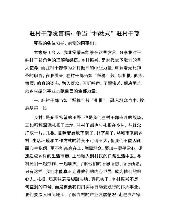 驻村干部发言稿:争当 “稻穗式” 驻村干部 2024-12-09 Word模板 85 购买前,请一定要先点击这里看看,欢迎持续关注,精彩模板每天推送 预览结束,本文件为word文档,一共5页,共2444字,请购买后,下载后查看 购买前,请一定要先点击这里看看,欢迎持续关注,精彩模板每天推送 资源下载下载价格29 RMBVIP免费升级VIP点击检测网盘有效后购买有任何充值和下载问题请加微信:xuexixuexi66 0 演讲发言