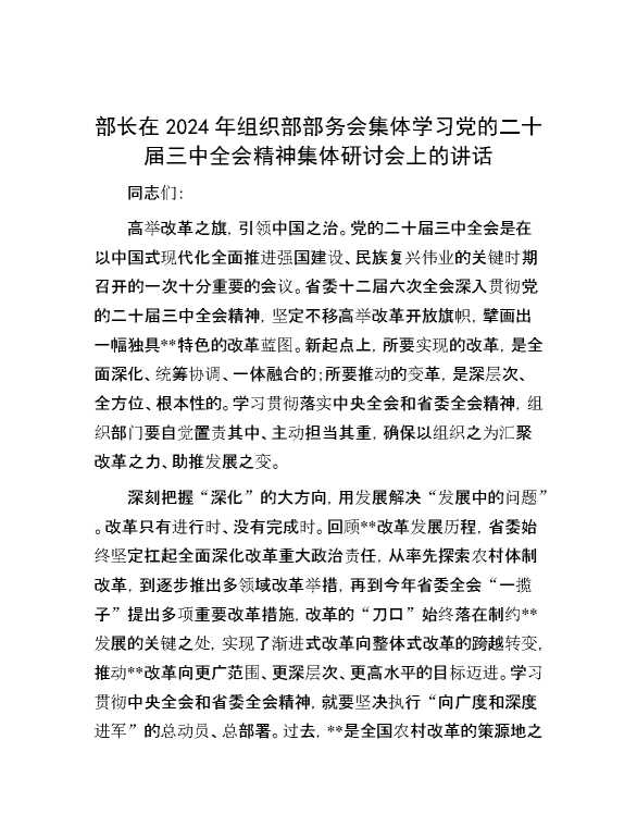 部长在2024年组织部部务会集体学习党的二十届三中全会精神集体研讨会上的讲话 2024-12-09 Word模板 85 购买前,请一定要先点击这里看看,欢迎持续关注,精彩模板每天推送 预览结束,本文件为word文档,一共6页,共2682字,请购买后,下载后查看 购买前,请一定要先点击这里看看,欢迎持续关注,精彩模板每天推送 资源下载下载价格29 RMBVIP免费升级VIP点击检测网盘有效后购买有任何充值和下载问题请加微信:xuexixuexi66 0 演讲发言