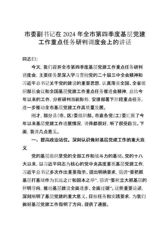 市委副书记在2024年全市第四季度基层党建工作重点任务研判调度会上的讲话 2024-12-09 Word模板 80 购买前,请一定要先点击这里看看,欢迎持续关注,精彩模板每天推送 预览结束,本文件为word文档,一共8页,共3705字,请购买后,下载后查看 购买前,请一定要先点击这里看看,欢迎持续关注,精彩模板每天推送 资源下载下载价格29 RMBVIP免费升级VIP点击检测网盘有效后购买有任何充值和下载问题请加微信:xuexixuexi66 0 演讲发言