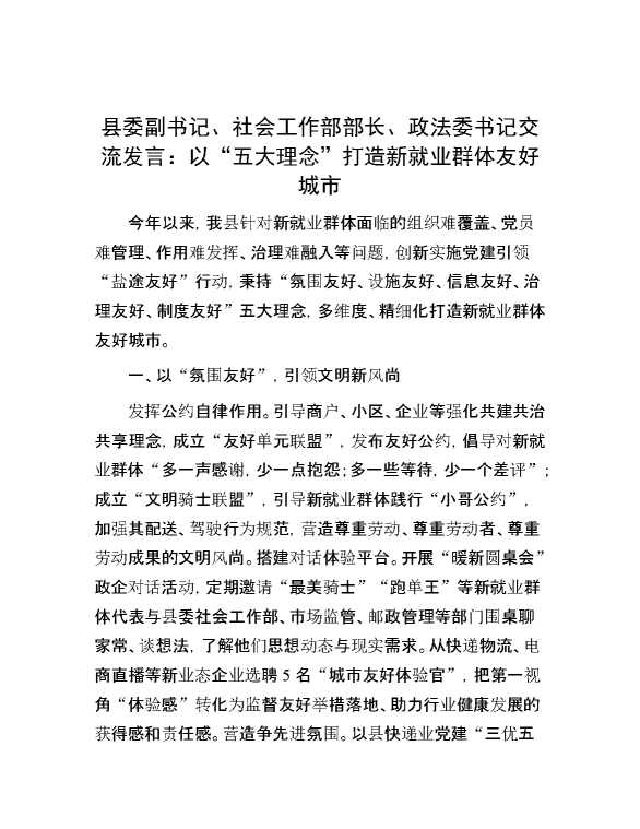 县委副书记、社会工作部部长、政法委书记交流发言:以“五大理念”打造新就业群体友好城市 2024-12-09 Word模板 83 购买前,请一定要先点击这里看看,欢迎持续关注,精彩模板每天推送 预览结束,本文件为word文档,一共4页,共1893字,请购买后,下载后查看 购买前,请一定要先点击这里看看,欢迎持续关注,精彩模板每天推送 资源下载下载价格29 RMBVIP免费升级VIP点击检测网盘有效后购买有任何充值和下载问题请加微信:xuexixuexi66 0 演讲发言