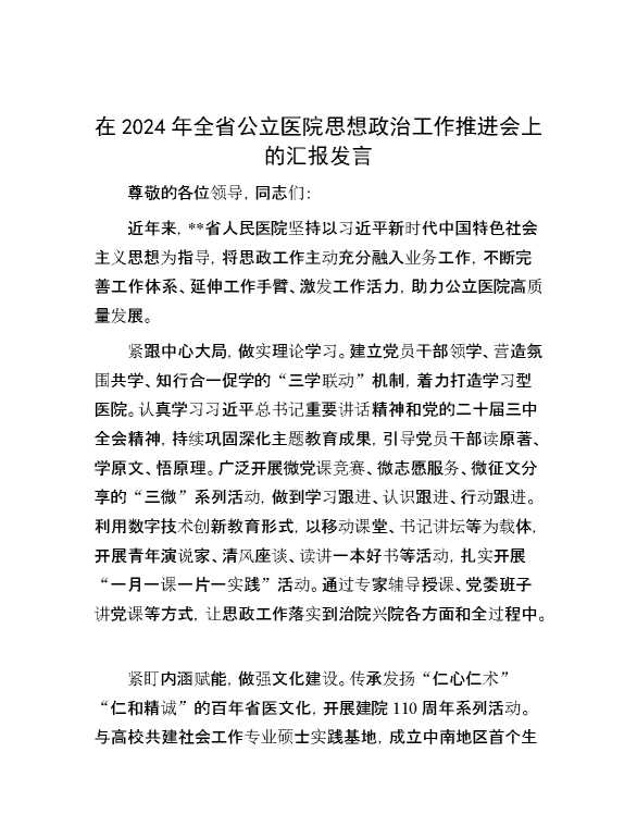 在2024年全省公立医院思想政治工作推进会上的汇报发言 2024-12-09 Word模板 76 购买前,请一定要先点击这里看看,欢迎持续关注,精彩模板每天推送 预览结束,本文件为word文档,一共4页,共1956字,请购买后,下载后查看 购买前,请一定要先点击这里看看,欢迎持续关注,精彩模板每天推送 资源下载下载价格29 RMBVIP免费升级VIP点击检测网盘有效后购买有任何充值和下载问题请加微信:xuexixuexi66 0 演讲发言