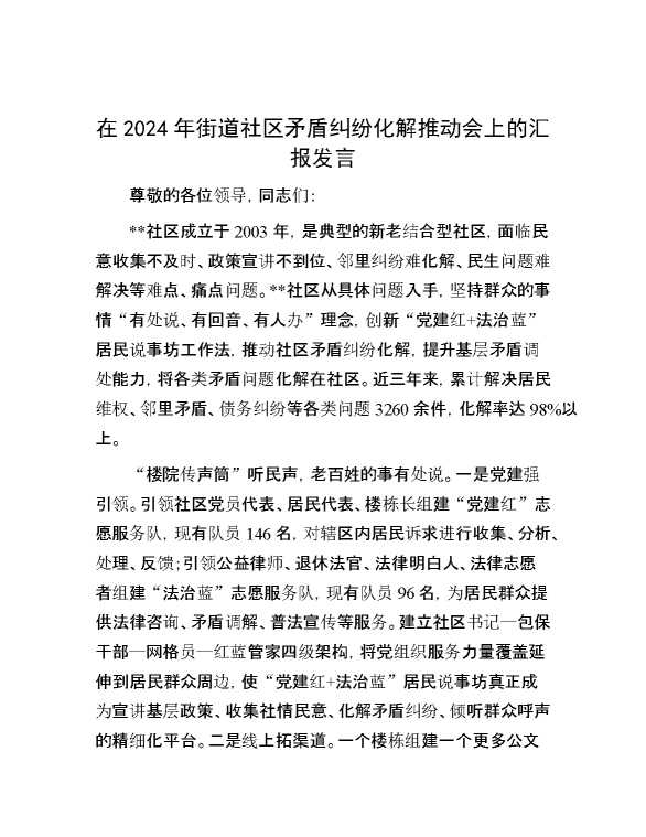 在2024年街道社区矛盾纠纷化解推动会上的汇报发言 2024-12-09 Word模板 84 购买前,请一定要先点击这里看看,欢迎持续关注,精彩模板每天推送 预览结束,本文件为word文档,一共5页,共2397字,请购买后,下载后查看 购买前,请一定要先点击这里看看,欢迎持续关注,精彩模板每天推送 资源下载下载价格29 RMBVIP免费升级VIP点击检测网盘有效后购买有任何充值和下载问题请加微信:xuexixuexi66 0 演讲发言