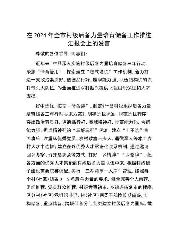 在2024年全市村级后备力量培育储备工作推进汇报会上的发言 2024-12-09 Word模板 77 购买前,请一定要先点击这里看看,欢迎持续关注,精彩模板每天推送 预览结束,本文件为word文档,一共5页,共2263字,请购买后,下载后查看 购买前,请一定要先点击这里看看,欢迎持续关注,精彩模板每天推送 资源下载下载价格29 RMBVIP免费升级VIP点击检测网盘有效后购买有任何充值和下载问题请加微信:xuexixuexi66 0 演讲发言