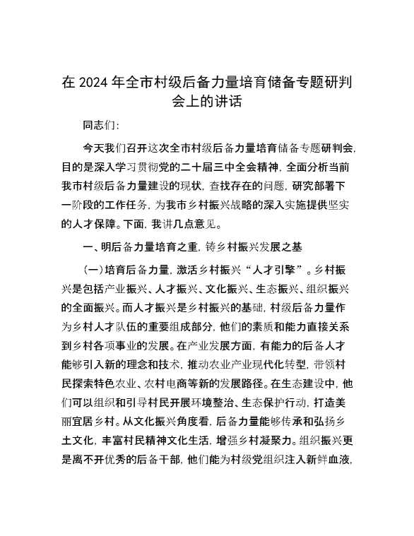 在2024年全市村级后备力量培育储备专题研判会上的讲话 2024-12-09 Word模板 80 购买前,请一定要先点击这里看看,欢迎持续关注,精彩模板每天推送 预览结束,本文件为word文档,一共6页,共3025字,请购买后,下载后查看 购买前,请一定要先点击这里看看,欢迎持续关注,精彩模板每天推送 资源下载下载价格29 RMBVIP免费升级VIP点击检测网盘有效后购买有任何充值和下载问题请加微信:xuexixuexi66 0 演讲发言