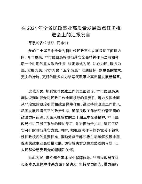 在2024年全省民政事业高质量发展重点任务推进会上的汇报发言 2024-12-09 Word模板 78 购买前,请一定要先点击这里看看,欢迎持续关注,精彩模板每天推送 预览结束,本文件为word文档,一共4页,共1500字,请购买后,下载后查看 购买前,请一定要先点击这里看看,欢迎持续关注,精彩模板每天推送 资源下载下载价格29 RMBVIP免费升级VIP点击检测网盘有效后购买有任何充值和下载问题请加微信:xuexixuexi66 0 演讲发言