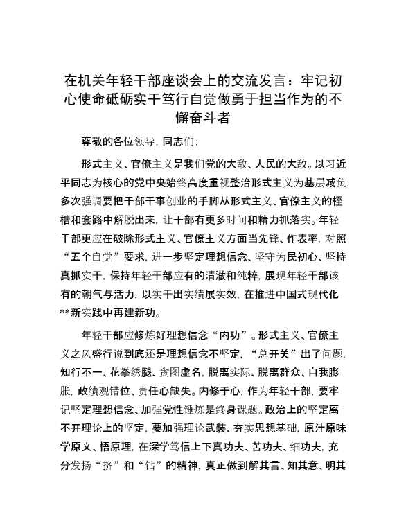 在机关年轻干部座谈会上的交流发言:牢记初心使命 砥砺实干笃行 自觉做勇于担当作为的不懈奋斗者 2024-12-09 Word模板 102 购买前,请一定要先点击这里看看,欢迎持续关注,精彩模板每天推送 预览结束,本文件为word文档,一共6页,共2640字,请购买后,下载后查看 购买前,请一定要先点击这里看看,欢迎持续关注,精彩模板每天推送 资源下载下载价格29 RMBVIP免费升级VIP点击检测网盘有效后购买有任何充值和下载问题请加微信:xuexixuexi66 0 演讲发言