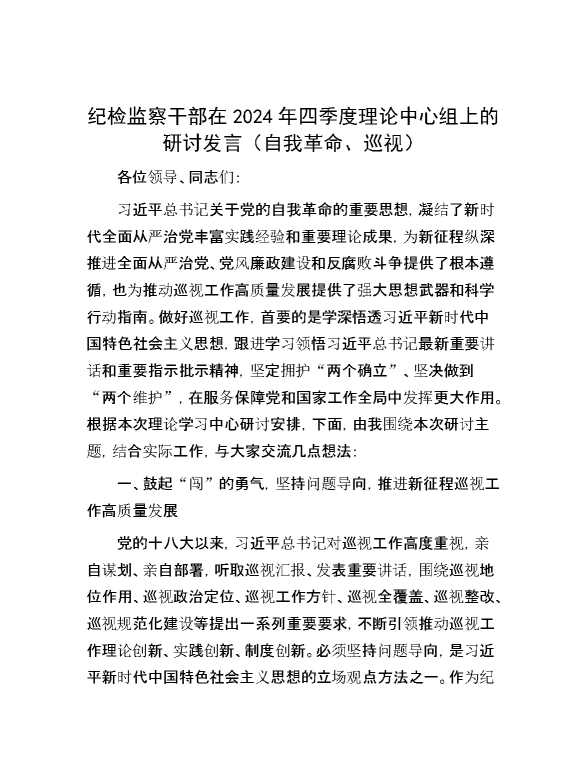 纪检监察干部在2024年四季度理论中心组上的研讨发言(自我革命、巡视) 2024-12-09 Word模板 83 购买前,请一定要先点击这里看看,欢迎持续关注,精彩模板每天推送 预览结束,本文件为word文档,一共8页,共3855字,请购买后,下载后查看 购买前,请一定要先点击这里看看,欢迎持续关注,精彩模板每天推送 资源下载下载价格29 RMBVIP免费升级VIP点击检测网盘有效后购买有任何充值和下载问题请加微信:xuexixuexi66 0 演讲发言