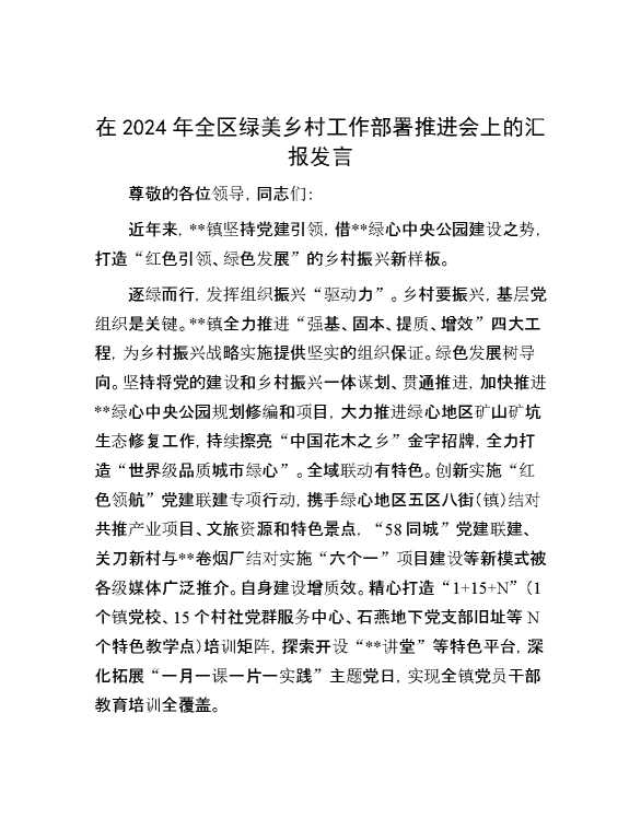 在2024年全区绿美乡村工作部署推进会上的汇报发言 2024-12-09 Word模板 80 购买前,请一定要先点击这里看看,欢迎持续关注,精彩模板每天推送 预览结束,本文件为word文档,一共6页,共2556字,请购买后,下载后查看 购买前,请一定要先点击这里看看,欢迎持续关注,精彩模板每天推送 资源下载下载价格29 RMBVIP免费升级VIP点击检测网盘有效后购买有任何充值和下载问题请加微信:xuexixuexi66 0 演讲发言