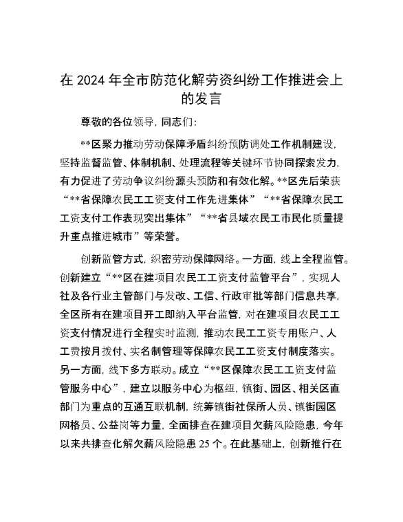 在2024年全市防范化解劳资纠纷工作推进会上的发言 2024-12-09 Word模板 87 购买前,请一定要先点击这里看看,欢迎持续关注,精彩模板每天推送 预览结束,本文件为word文档,一共5页,共2406字,请购买后,下载后查看 购买前,请一定要先点击这里看看,欢迎持续关注,精彩模板每天推送 资源下载下载价格29 RMBVIP免费升级VIP点击检测网盘有效后购买有任何充值和下载问题请加微信:xuexixuexi66 0 演讲发言