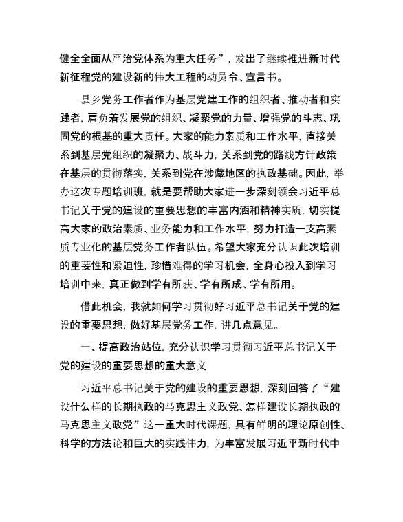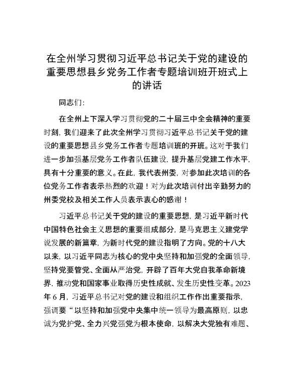 在全州学习贯彻习近平总书记关于党的建设的重要思想县乡党务工作者专题培训班开班式上的讲话 2024-12-09 Word模板 82 购买前,请一定要先点击这里看看,欢迎持续关注,精彩模板每天推送 预览结束,本文件为word文档,一共8页,共3692字,请购买后,下载后查看 购买前,请一定要先点击这里看看,欢迎持续关注,精彩模板每天推送 资源下载下载价格29 RMBVIP免费升级VIP立即购买有任何充值和下载问题请加微信:xuexixuexi66 0 演讲发言