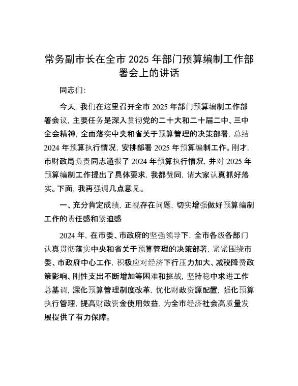 常务副市长在全市2025年部门预算编制工作部署会上的讲话 2024-12-09 Word模板 79 购买前,请一定要先点击这里看看,欢迎持续关注,精彩模板每天推送 预览结束,本文件为word文档,一共8页,共3446字,请购买后,下载后查看 购买前,请一定要先点击这里看看,欢迎持续关注,精彩模板每天推送 资源下载下载价格29 RMBVIP免费升级VIP点击检测网盘有效后购买有任何充值和下载问题请加微信:xuexixuexi66 0 演讲发言