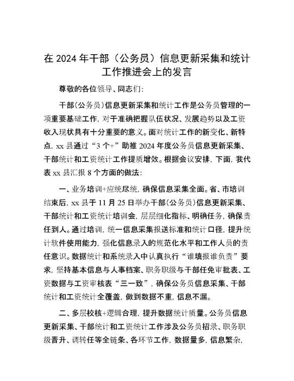 在2024年干部(公务员)信息更新采集和统计工作推进会上的发言 2024-12-09 Word模板 86 购买前,请一定要先点击这里看看,欢迎持续关注,精彩模板每天推送 预览结束,本文件为word文档,一共4页,共1749字,请购买后,下载后查看 购买前,请一定要先点击这里看看,欢迎持续关注,精彩模板每天推送 资源下载下载价格29 RMBVIP免费升级VIP点击检测网盘有效后购买有任何充值和下载问题请加微信:xuexixuexi66 0 演讲发言