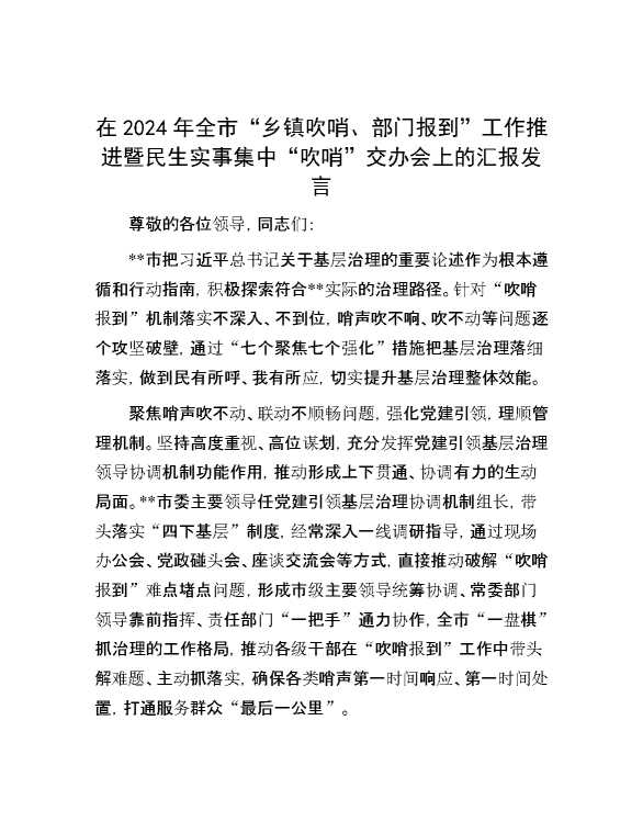 在2024年全市“乡镇吹哨、部门报到”工作推进暨民生实事集中“吹哨”交办会上的汇报发言 2024-12-09 Word模板 101 购买前,请一定要先点击这里看看,欢迎持续关注,精彩模板每天推送 预览结束,本文件为word文档,一共4页,共1802字,请购买后,下载后查看 购买前,请一定要先点击这里看看,欢迎持续关注,精彩模板每天推送 资源下载下载价格29 RMBVIP免费升级VIP点击检测网盘有效后购买有任何充值和下载问题请加微信:xuexixuexi66 0 演讲发言
