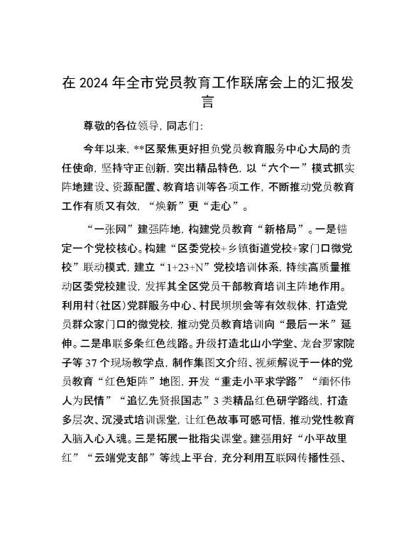 在2024年全市党员教育工作联席会上的汇报发言 2024-12-09 Word模板 79 购买前,请一定要先点击这里看看,欢迎持续关注,精彩模板每天推送 预览结束,本文件为word文档,一共6页,共2891字,请购买后,下载后查看 购买前,请一定要先点击这里看看,欢迎持续关注,精彩模板每天推送 资源下载下载价格29 RMBVIP免费升级VIP点击检测网盘有效后购买有任何充值和下载问题请加微信:xuexixuexi66 0 演讲发言