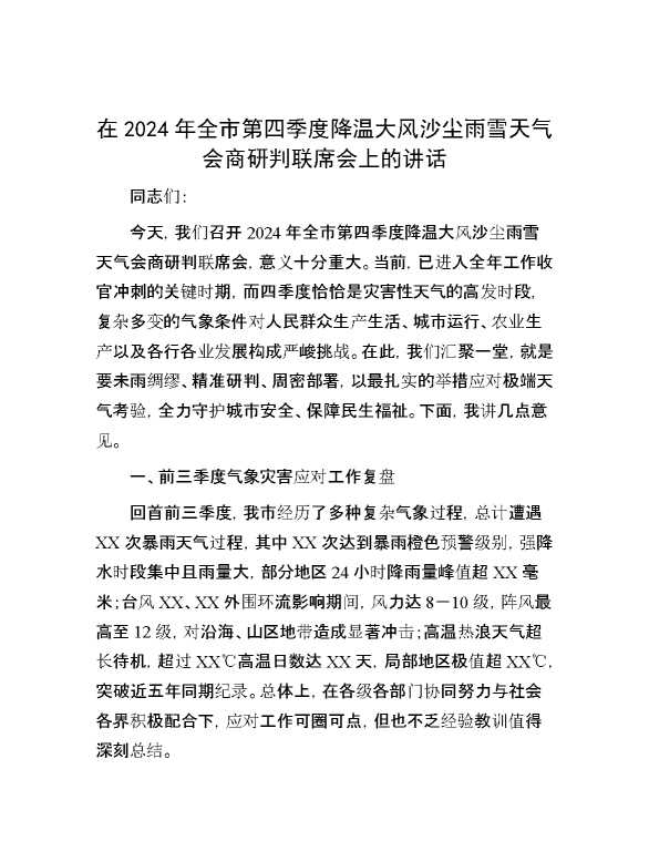 在2024年全市第四季度降温大风沙尘雨雪天气会商研判联席会上的讲话 2024-12-09 Word模板 83 购买前,请一定要先点击这里看看,欢迎持续关注,精彩模板每天推送 预览结束,本文件为word文档,一共8页,共3630字,请购买后,下载后查看 购买前,请一定要先点击这里看看,欢迎持续关注,精彩模板每天推送 资源下载下载价格29 RMBVIP免费升级VIP点击检测网盘有效后购买有任何充值和下载问题请加微信:xuexixuexi66 0 演讲发言