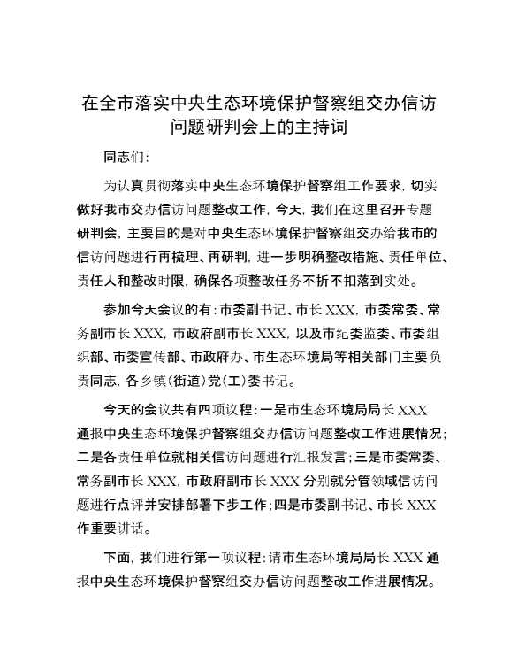 在全市落实中央生态环境保护督察组交办信访问题研判会上的主持词 2024-12-09 Word模板 80 购买前,请一定要先点击这里看看,欢迎持续关注,精彩模板每天推送 预览结束,本文件为word文档,一共5页,共2023字,请购买后,下载后查看 购买前,请一定要先点击这里看看,欢迎持续关注,精彩模板每天推送 资源下载下载价格29 RMBVIP免费升级VIP点击检测网盘有效后购买有任何充值和下载问题请加微信:xuexixuexi66 0 演讲发言