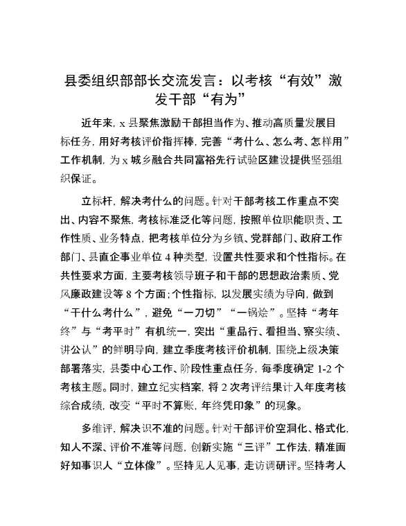 县委组织部部长交流发言:以考核“有效”激发干部“有为” 2024-12-09 Word模板 80 购买前,请一定要先点击这里看看,欢迎持续关注,精彩模板每天推送 预览结束,本文件为word文档,一共3页,共1441字,请购买后,下载后查看 购买前,请一定要先点击这里看看,欢迎持续关注,精彩模板每天推送 资源下载下载价格29 RMBVIP免费升级VIP点击检测网盘有效后购买有任何充值和下载问题请加微信:xuexixuexi66 0 演讲发言